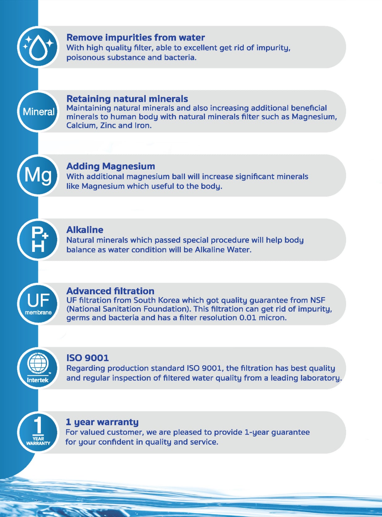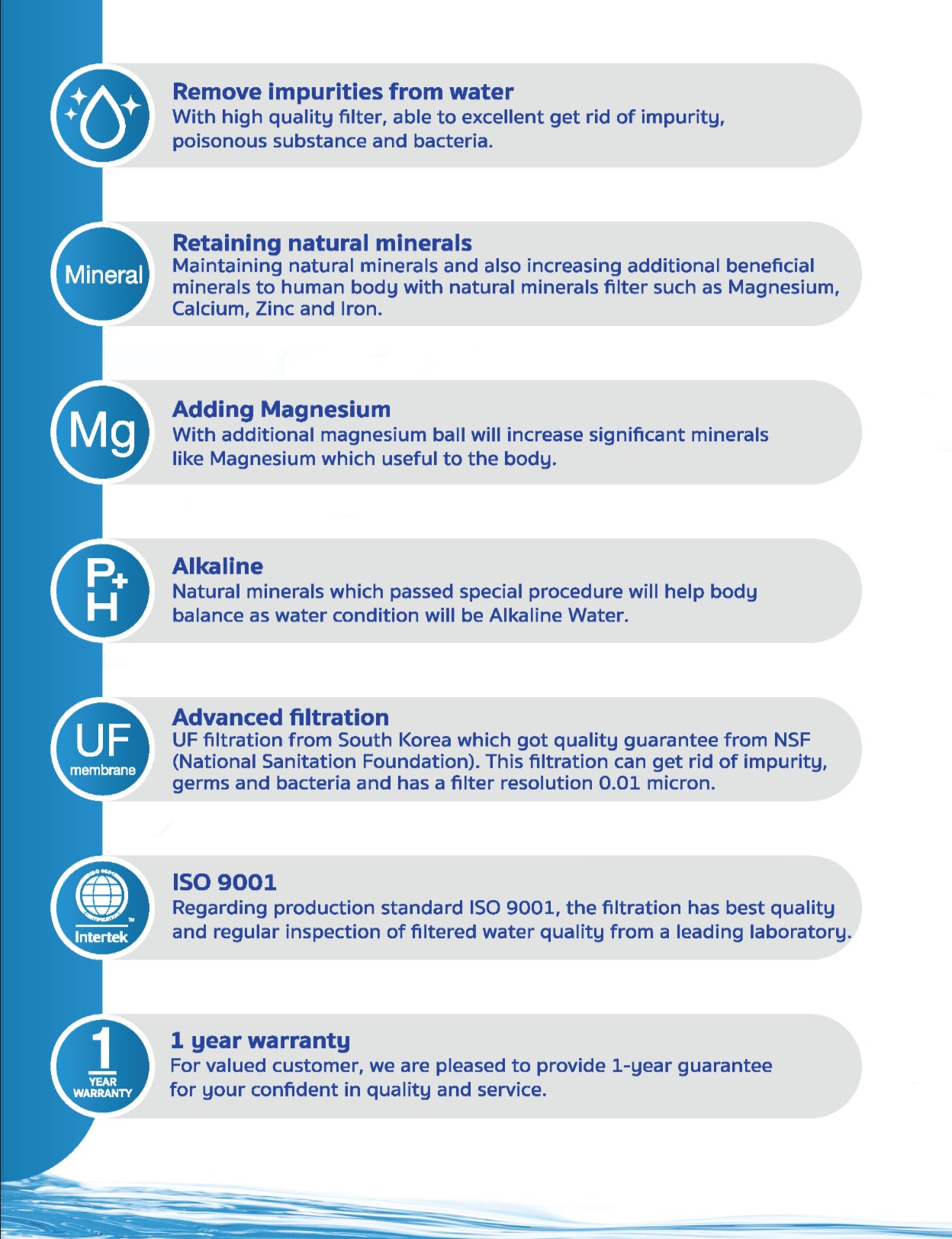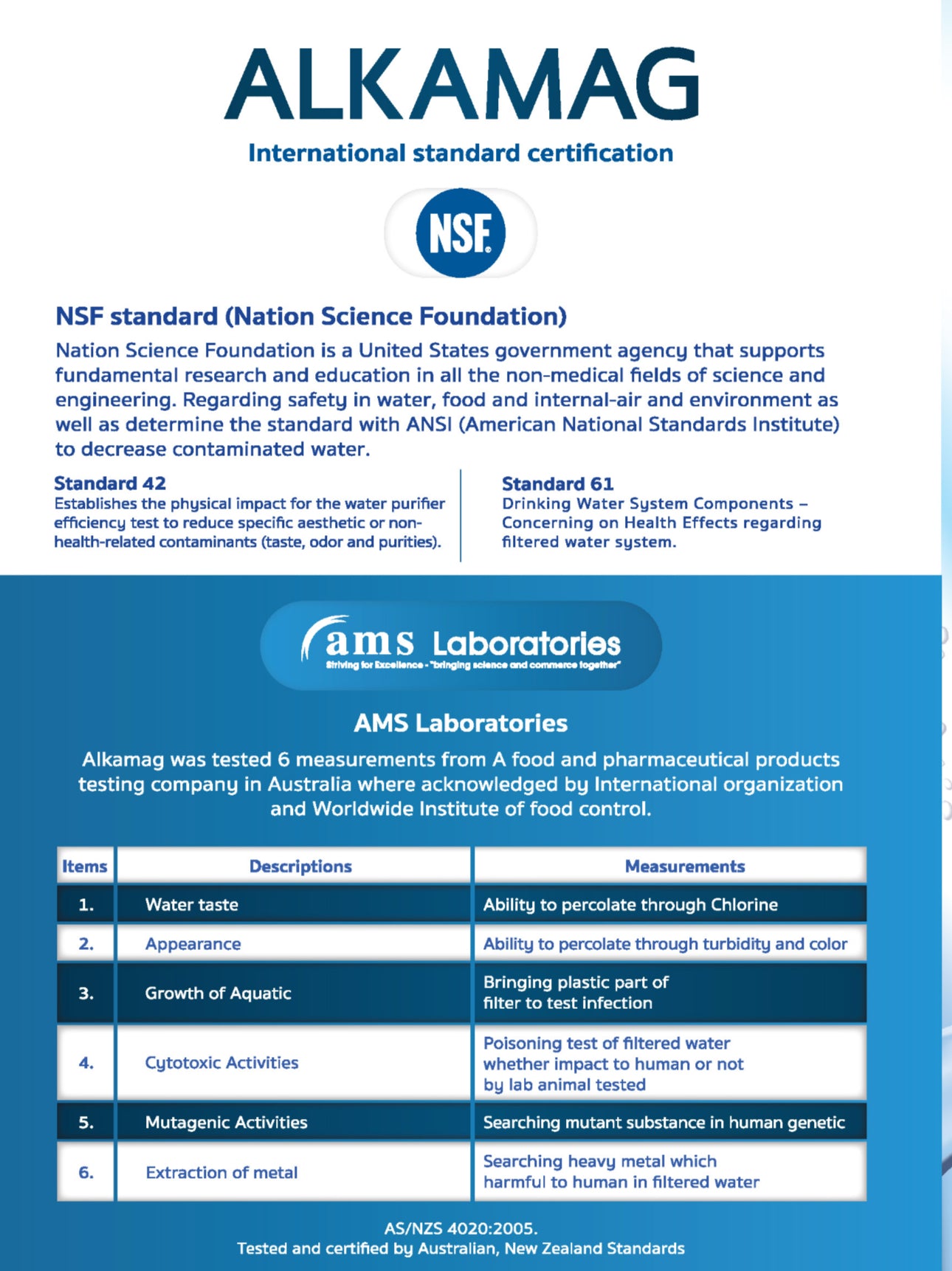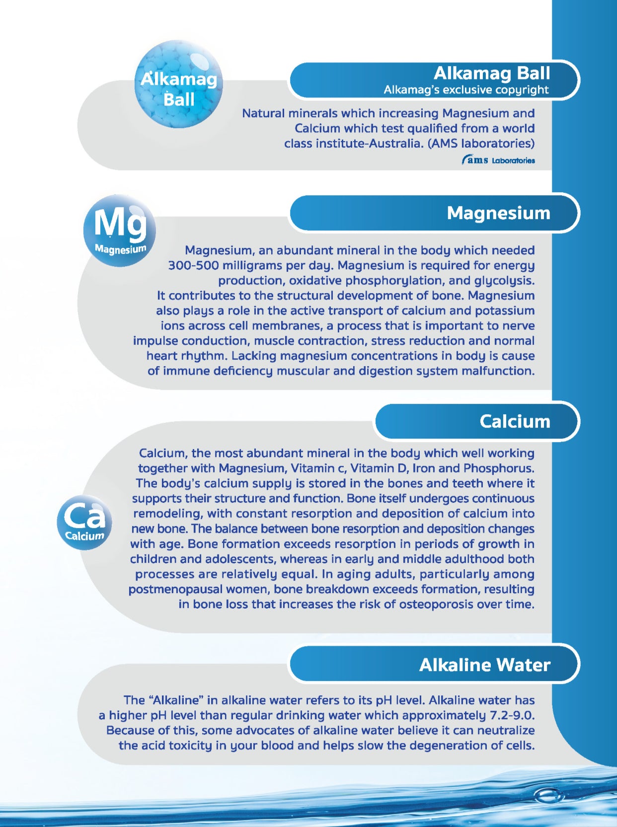 ALKAMAG هو فلتر مياه منزلي مبتكر يعمل دون كهرباء، يقوم بتحويل مياه الصنبور العادية إلى مياه قلوية غنية بالمعادن، خالية من الشوائب، ومحسّنة في الطعم والترطيب. تصميمه الذكي يجعله مثاليًا للمنازل والمكاتب والصالات والمقاهي.