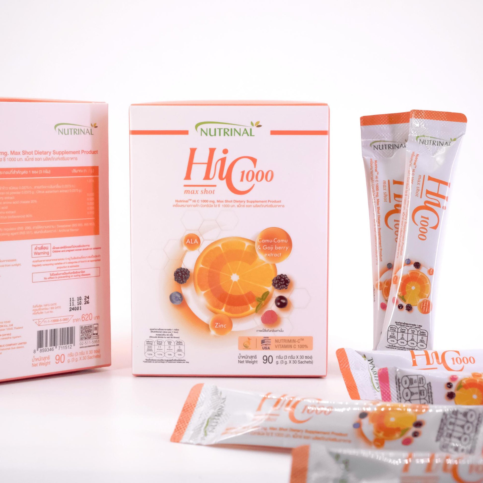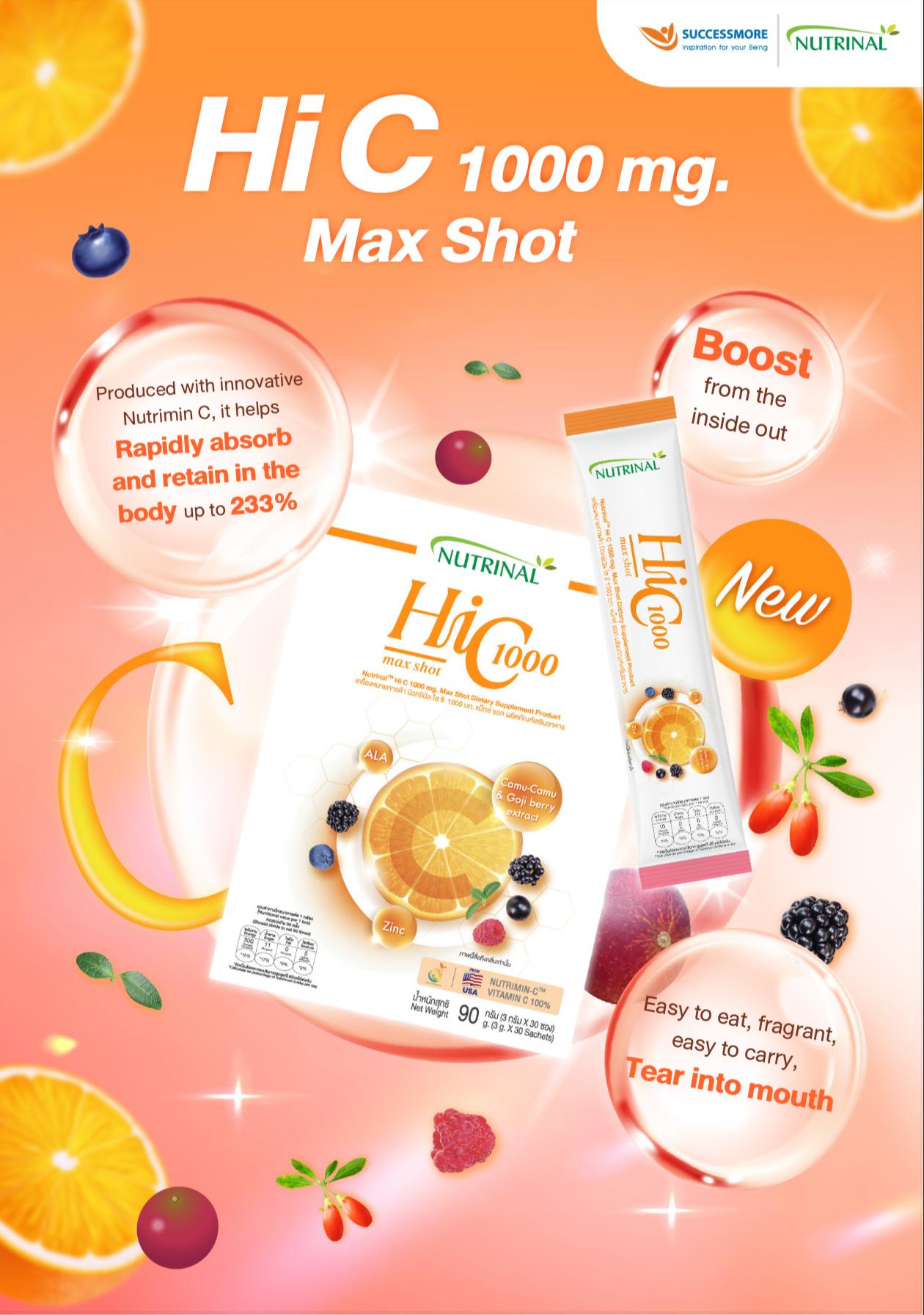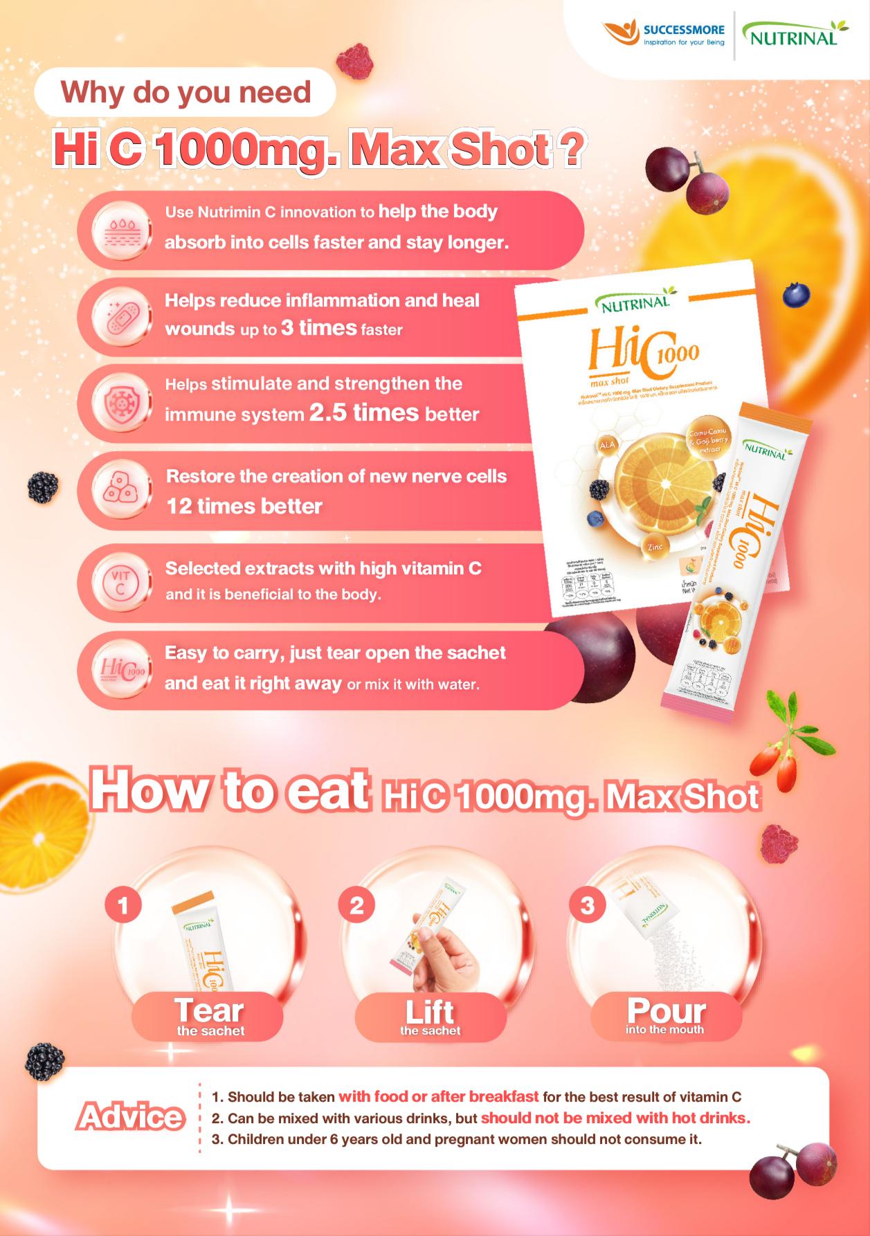 Hi C 1000mg Max Shot هو مكمل غذائي سائل يحتوي على فيتامين C عالي الفعالية وسريع الامتصاص، مصمّم لدعم المناعة، مكافحة الإجهاد التأكسدي، وتعزيز طاقة الجسم ونضارة البشرة.