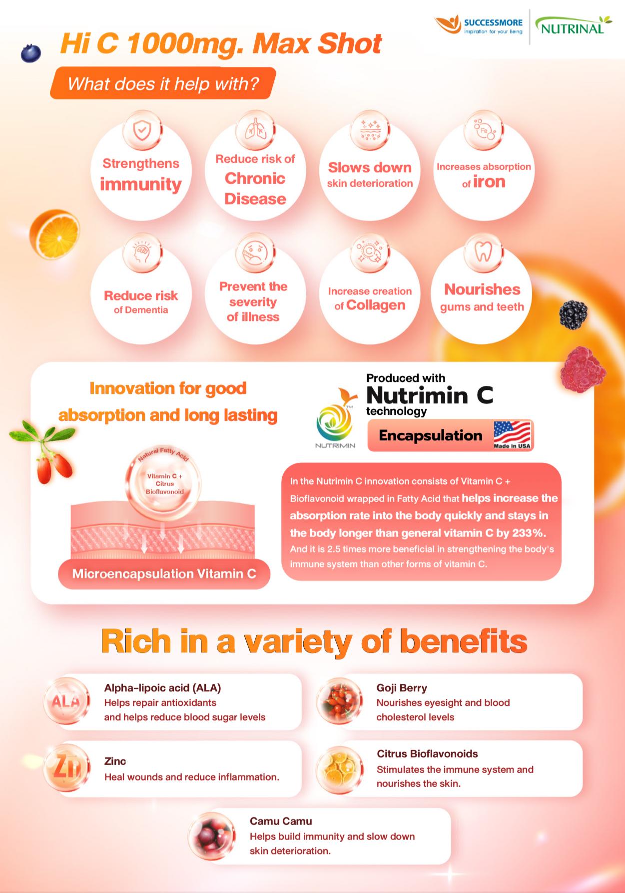 التركيبة المتقدمة تعتمد على Nutrimin-C™ – مزيج مسجّل يجمع بين فيتامين C، أحماض دهنية وفلافونويدات حمضية – لامتصاص فائق وفعالية أعلى من الأقراص أو المساحيق التقليدية.