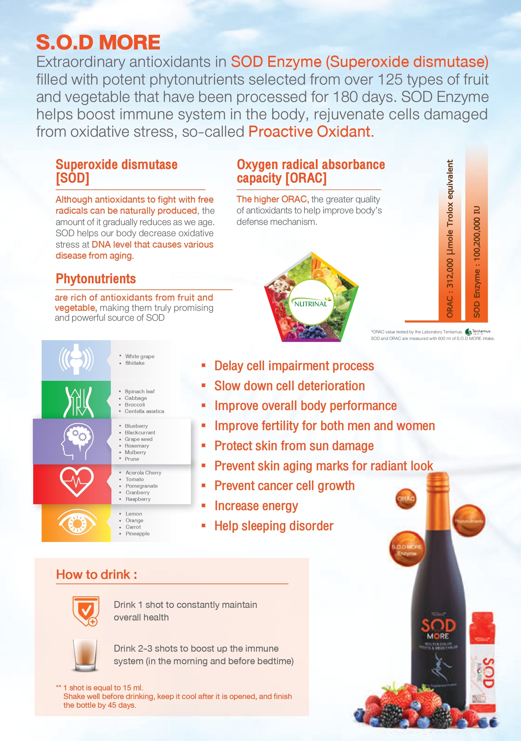 SOD MORE هو مشروب غذائي فائق مضاد للأكسدة، مصمم لحماية خلايا الجسم من التلف التأكسدي، ودعم التجدد الخلوي الطبيعي. بتركيبة فريدة تحتوي على 125 مكونًا نباتيًا مخمّرًا، إنزيم SOD، ومؤشر ORAC مرتفع يبلغ 312,000 µmol، يساهم هذا المشروب في تعزيز الحيوية والصحة الداخلية ومقاومة آثار الشيخوخة.