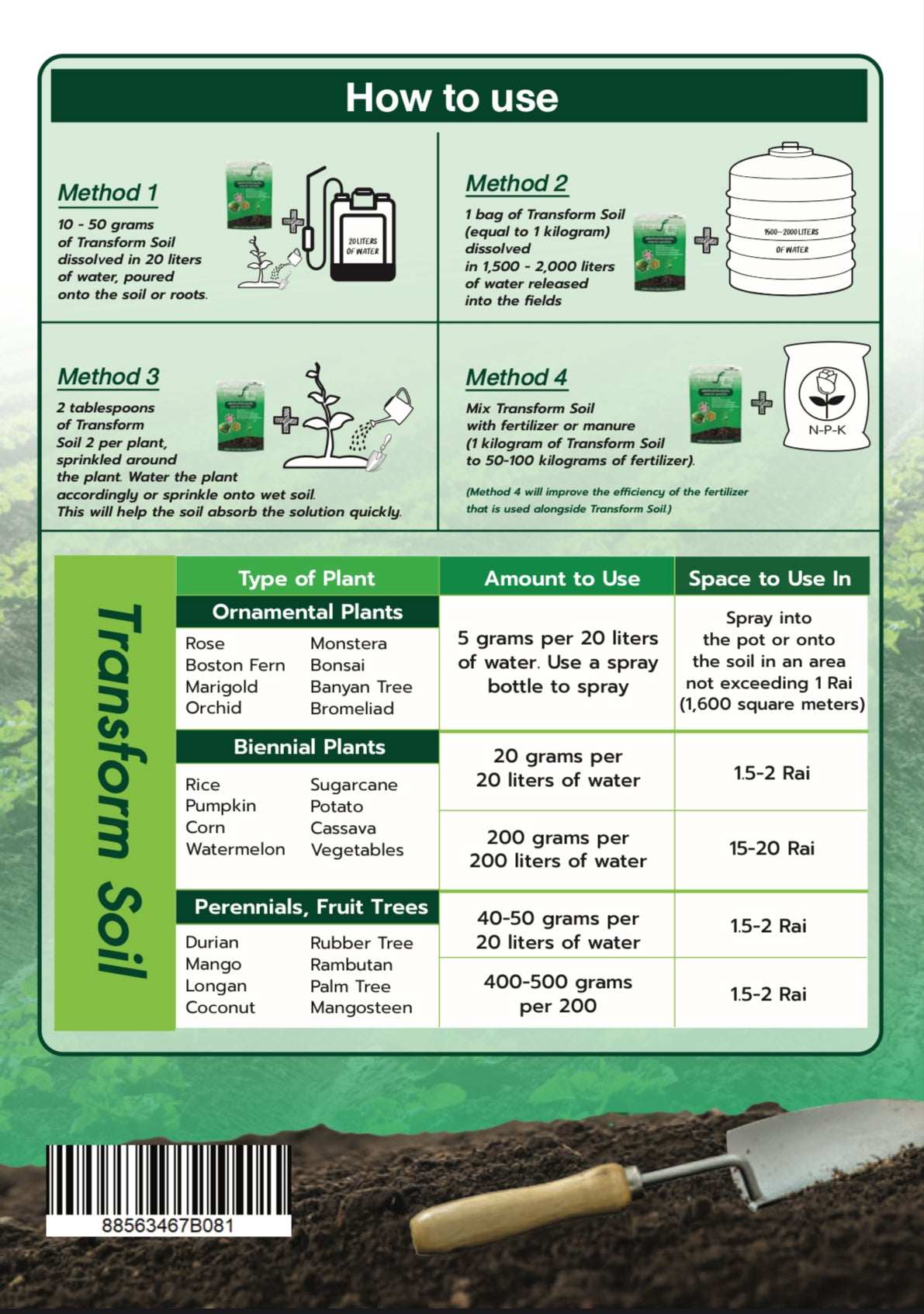 Dissolve 1 kilogram of Transform Soil in 1,500–2,000 liters of water and spray over large areas (recommended for farms or wide planting zones).